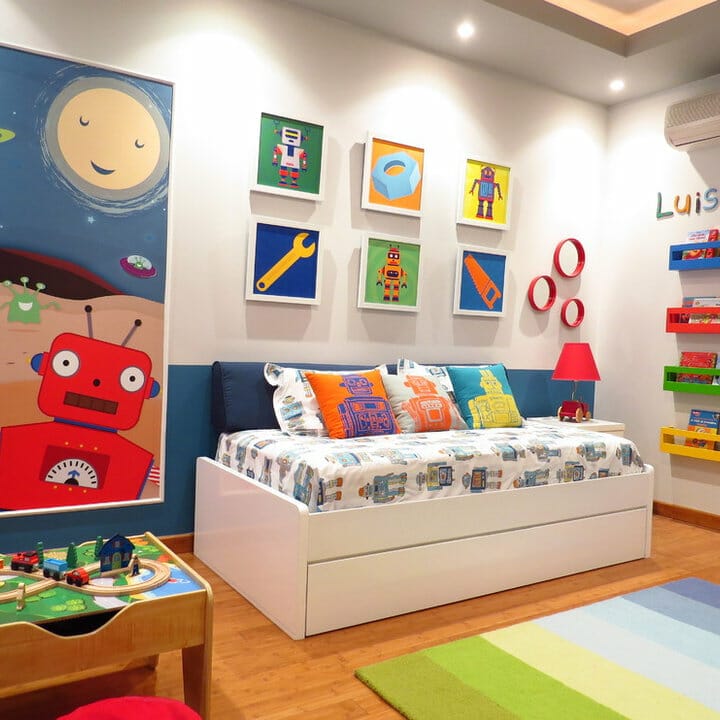 It is time to tell your little robot that he is not one but may have a room with such a theme, instead. With a huge painting, bedding, cushions, and framed colorful pictures, all in the flow, you could ensure he has everything.