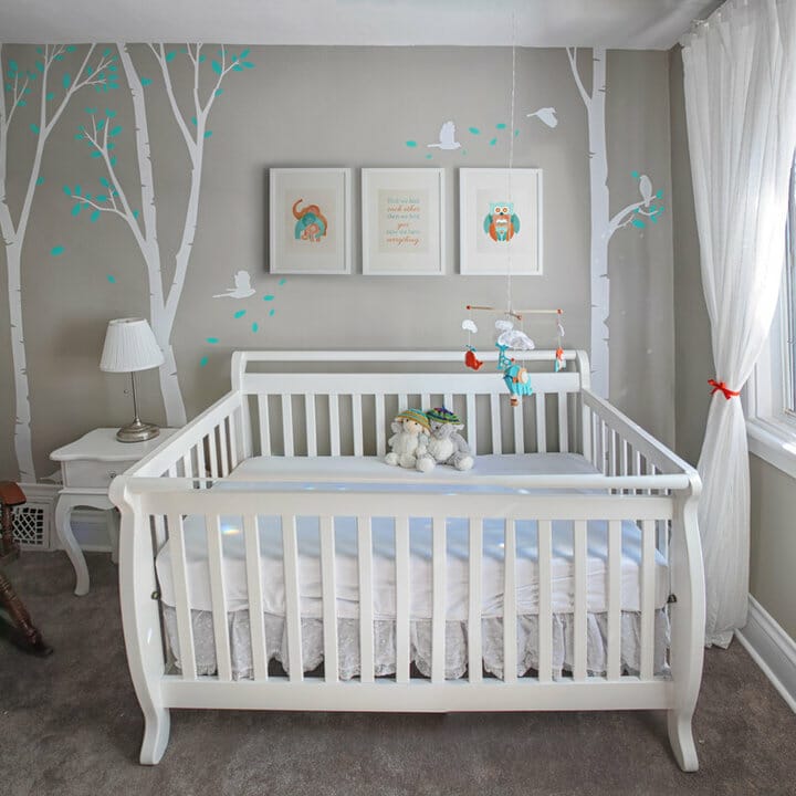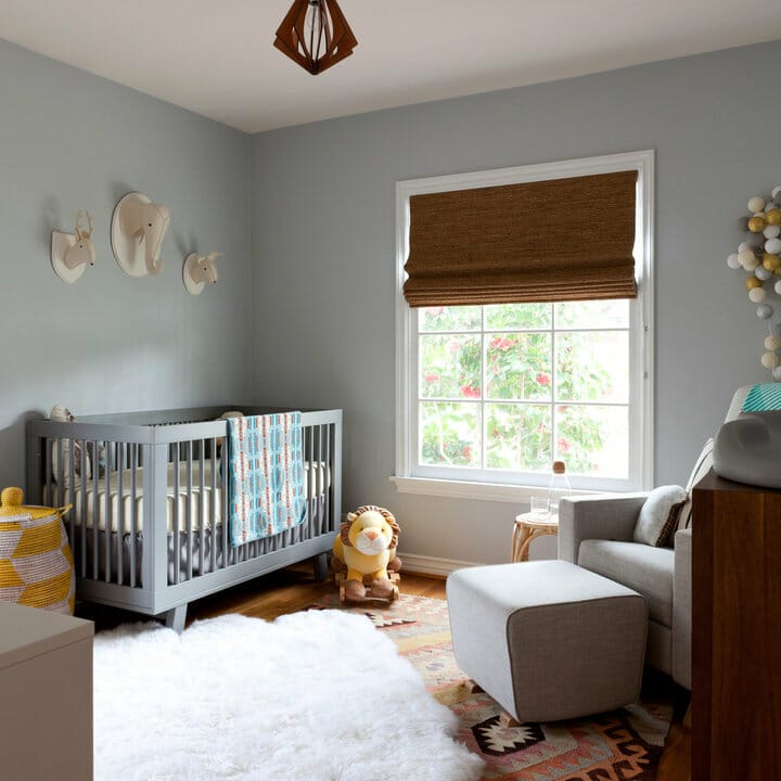 On the wholescale, this toddler room heads to Scandinavian style. That tendency shows on the gray patterned carpet, turquoise crib, and the medium-tone wooden dresser.