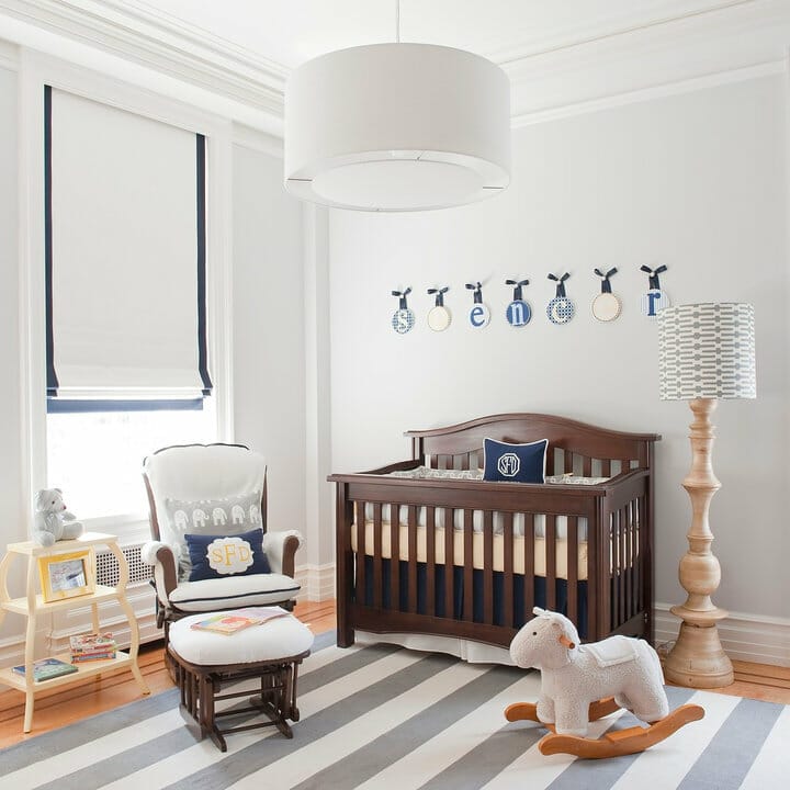 Explicitly, a tall floor lamp is there to illuminate your baby boy during sleeping while the hanging pendant is ready to accompany his happy pre-sleeping playing time.