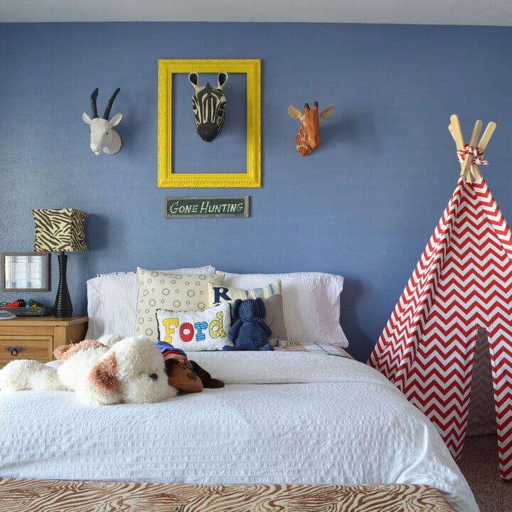 Here, some decorations for a little hunter, like animal heads, zebra patterns, and chevron red teepee, are present to complete the cornflower-blue toned wall. But, where is your boy? Oh, he has GONE HUNTING.