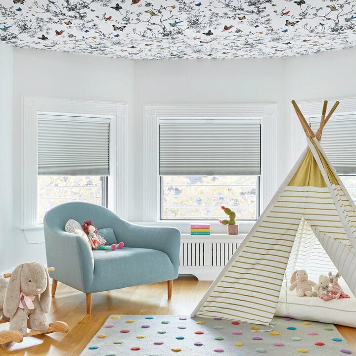 It is not only because of the paper printed in birds and butterflies on the ceiling but also the tufted polka dot area rug.