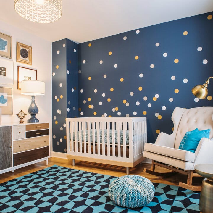 Toddler room ideas in this boy nursery include a blue scheme with golden details.