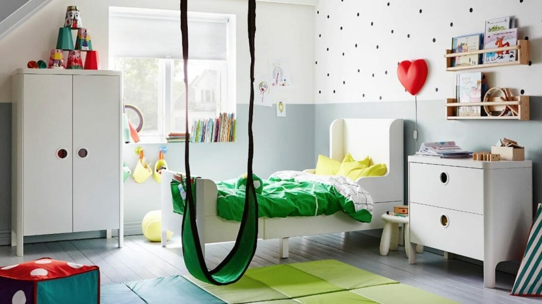Modern and refreshing are the words that best describe this girl’s bedroom. The white furniture set, including a drawer chest, an extendable bed, and a wardrobe for kids, make the green accents on the bedcover, sling, and gym mat stand out.