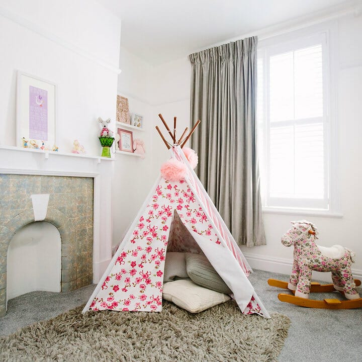 Your beautiful little camper will feel contented with this floral teepee. She will like it even more with a set of soft tulle pompom balls hung at the top.