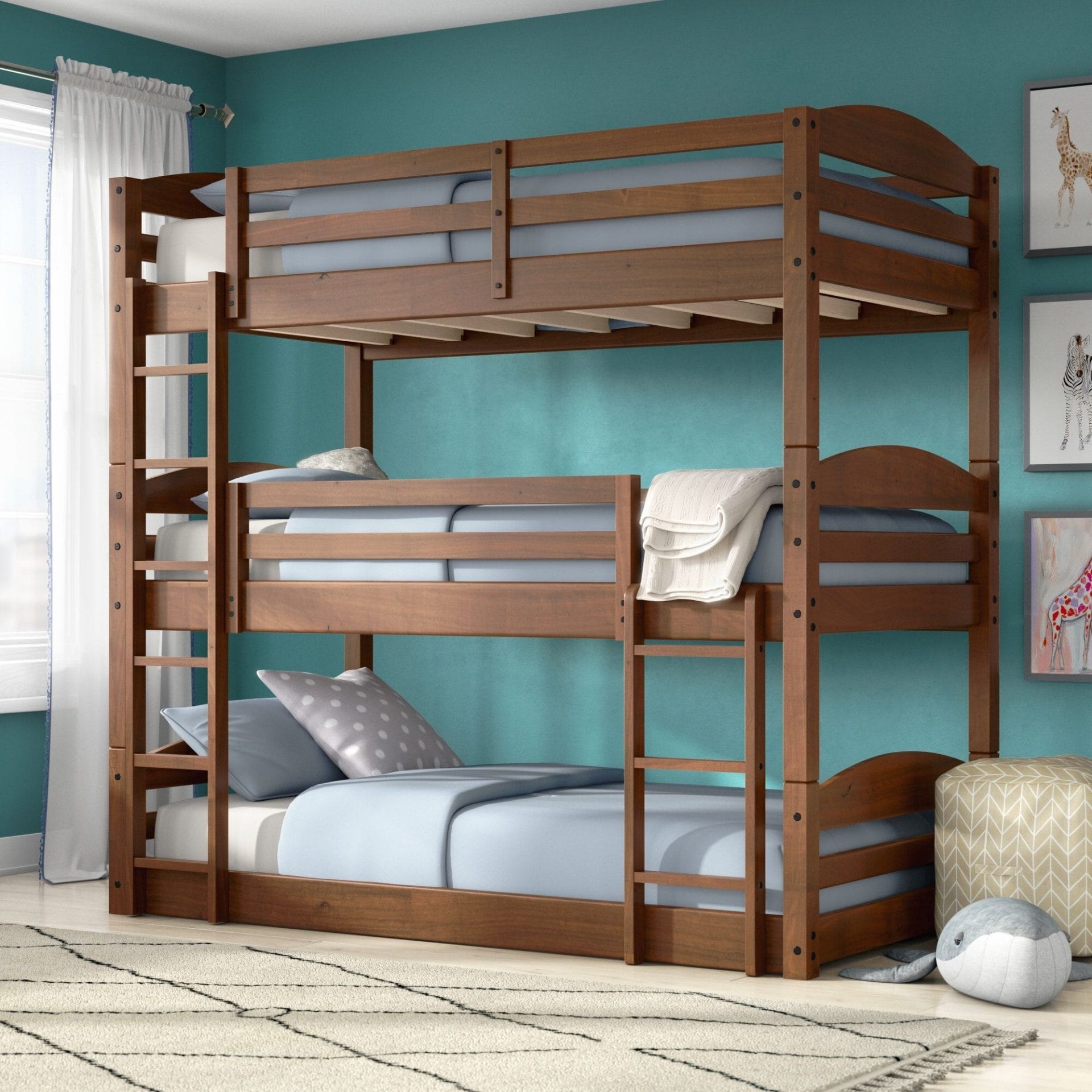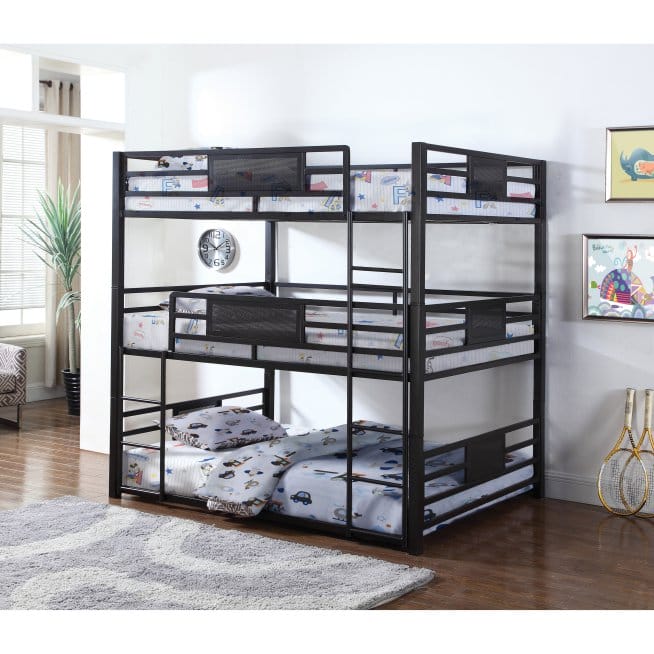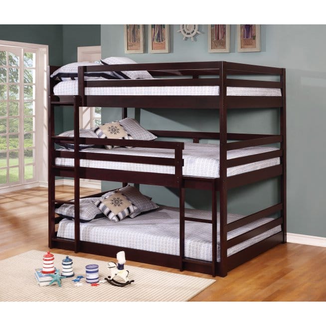 Here is a full-size triple-decker bed. This furniture item ensures that your kids feel comfortable when they sleep in it. Moreover, it celebrates a contemporary style. Since the bed comes in a dark finish, it produces visual drama.