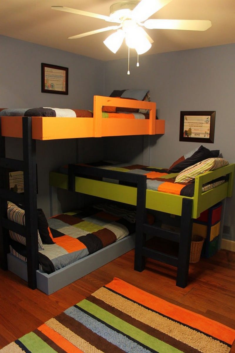 This 3-tiered bunk bed is designed and built to sleep for three twin boys. The three beds are perfectly positioned on top of each other. No doubt, it makes the most out of a compact space.