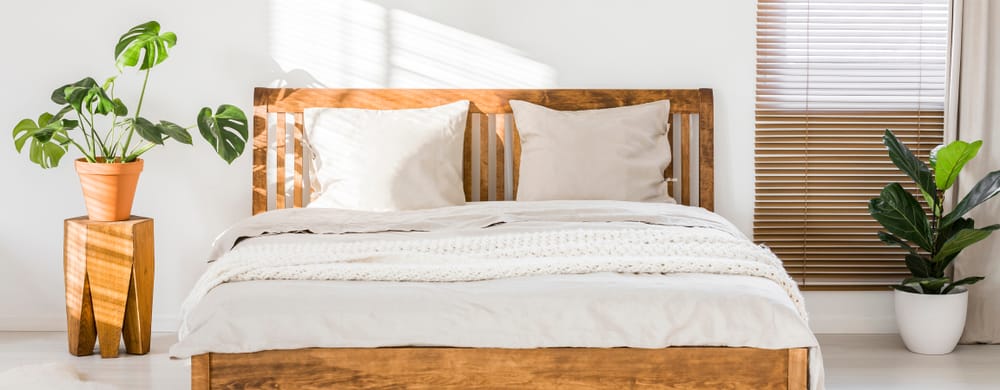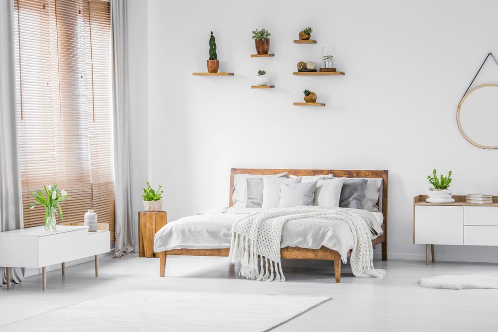 If you want a bedroom that never fades, go for white and wood combo. Wooden furniture units convey timeless beauty. White bedding, floor, and walls offer a sense of refinement.