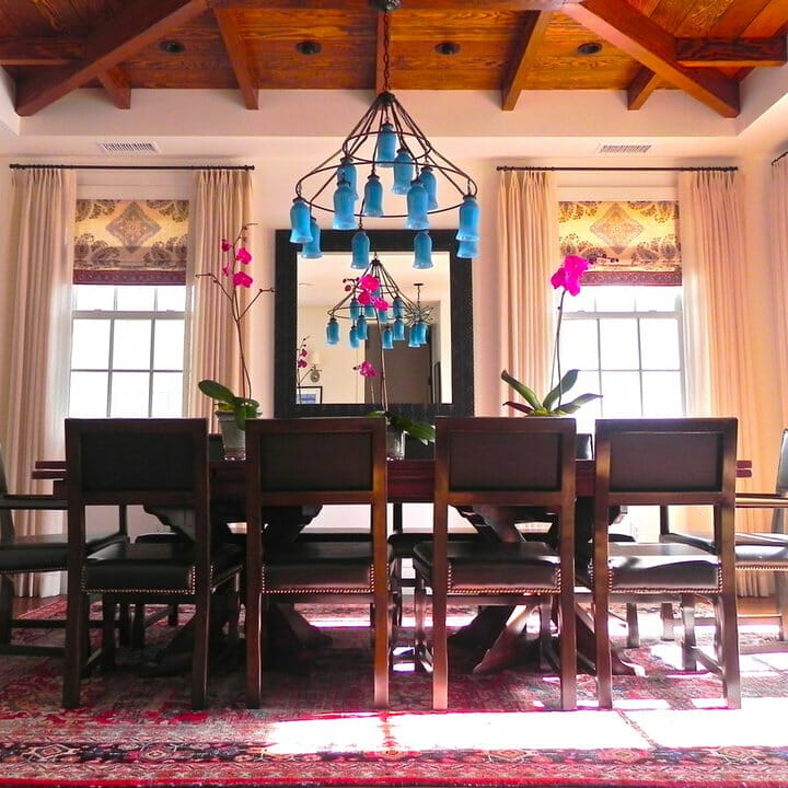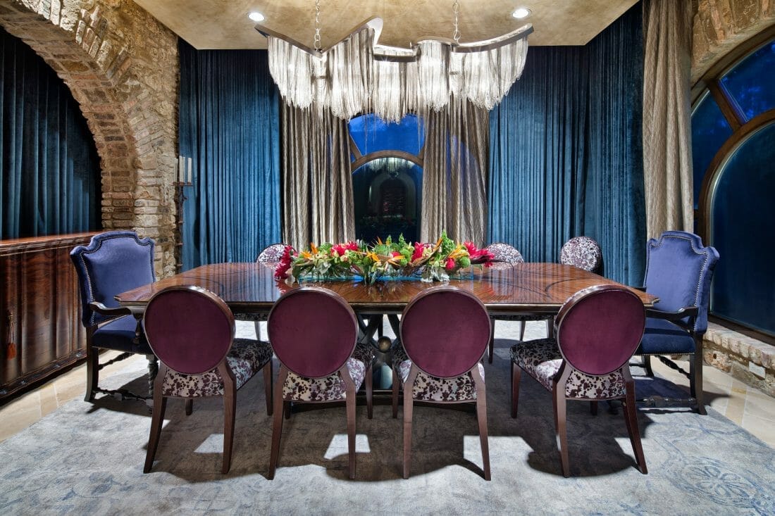 The drapes, wall sconces, and pendants give the dining space formal symmetry. In addition, they produce Moroccan vibes.