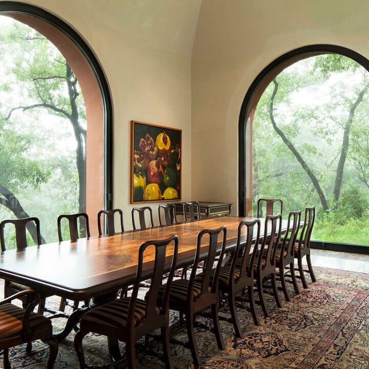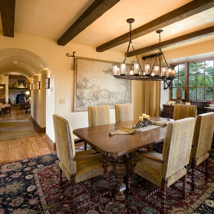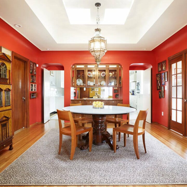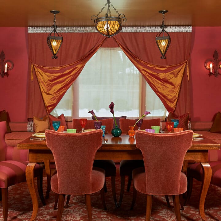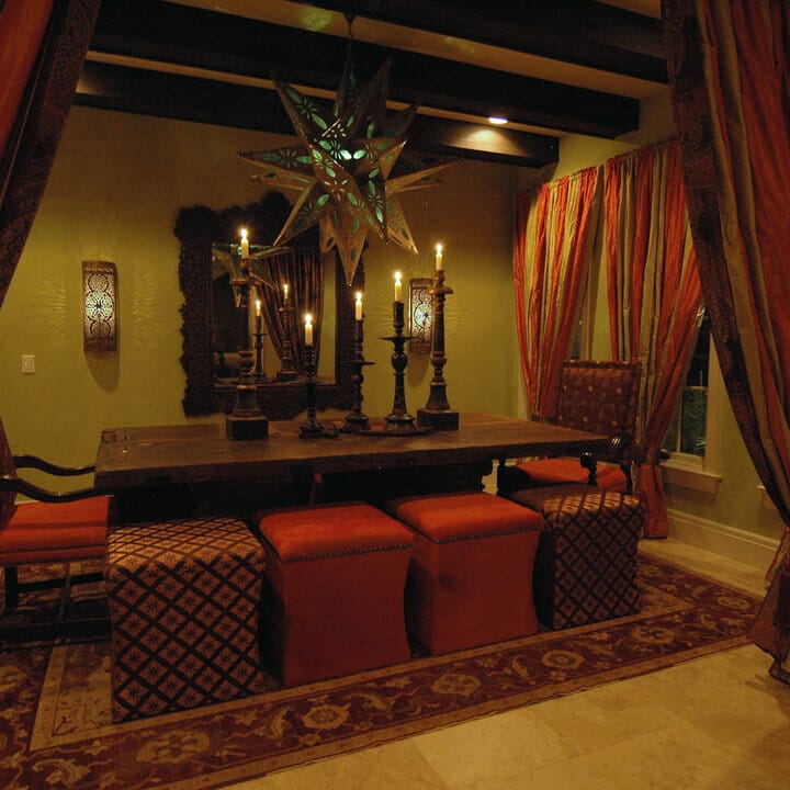 Here, archways make an outstanding entry to the Moroccan-Tuscan dining space. Furthermore, burnt red walls exude intimacy and warmth.