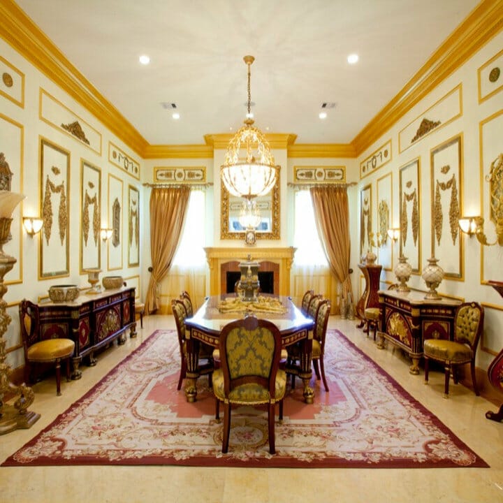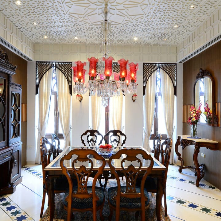 The golden mirror, Moroccan dining room chandelier, trim details, cushions, and drapes evoke unparalleled glamor. Intricate wall ornaments, sideboards, and sconces ooze grandeur.