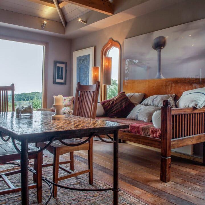 The striped throw pillow, dining table, area rug, wooden archway, and seat cover give the dining area Moroccan touches. Furthermore, they produce interest while injecting some warmth.