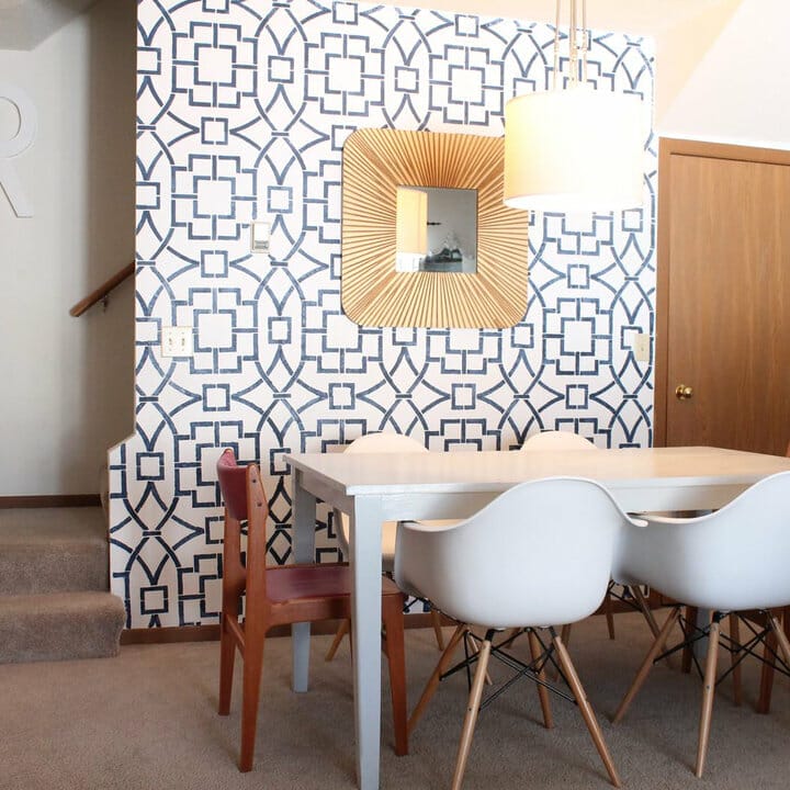 The Moroccan-themed wall panel offers an endearing backdrop for the mirror. Meanwhile, the pendant and dining area furniture pieces emanate a mid-century modern ambiance.