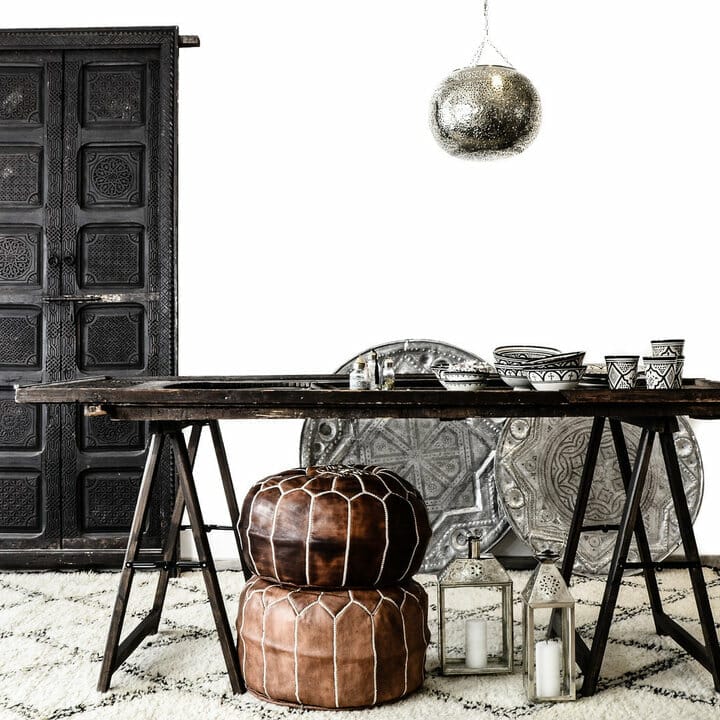 Stacked leather Moroccan poufs carve a homey ambiance. Moreover, monochromatic tableware items heighten the exotic atmosphere. Because of the geometric rug, the dining space seems more stylish.