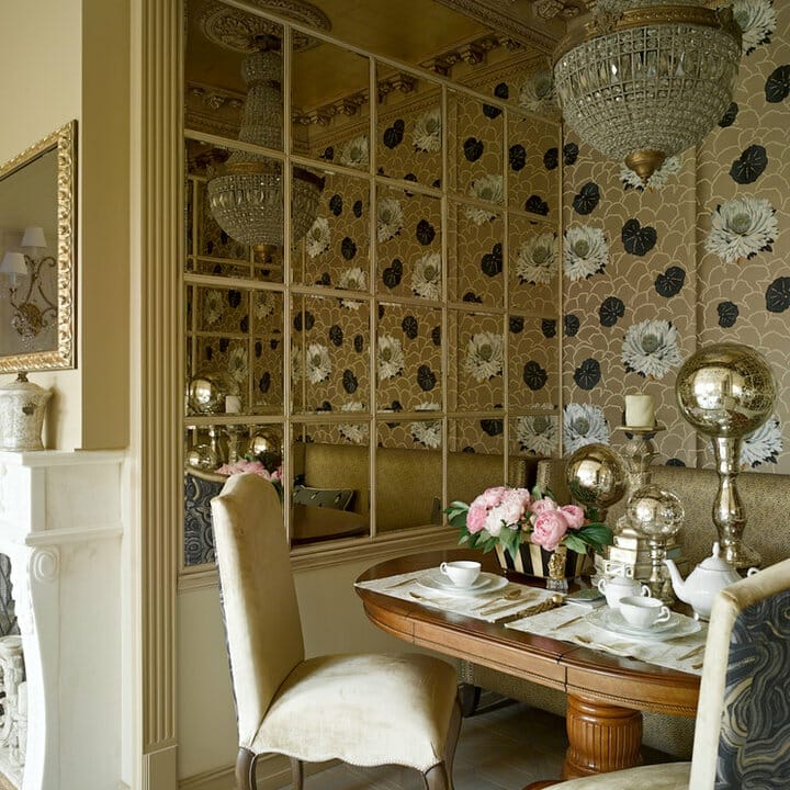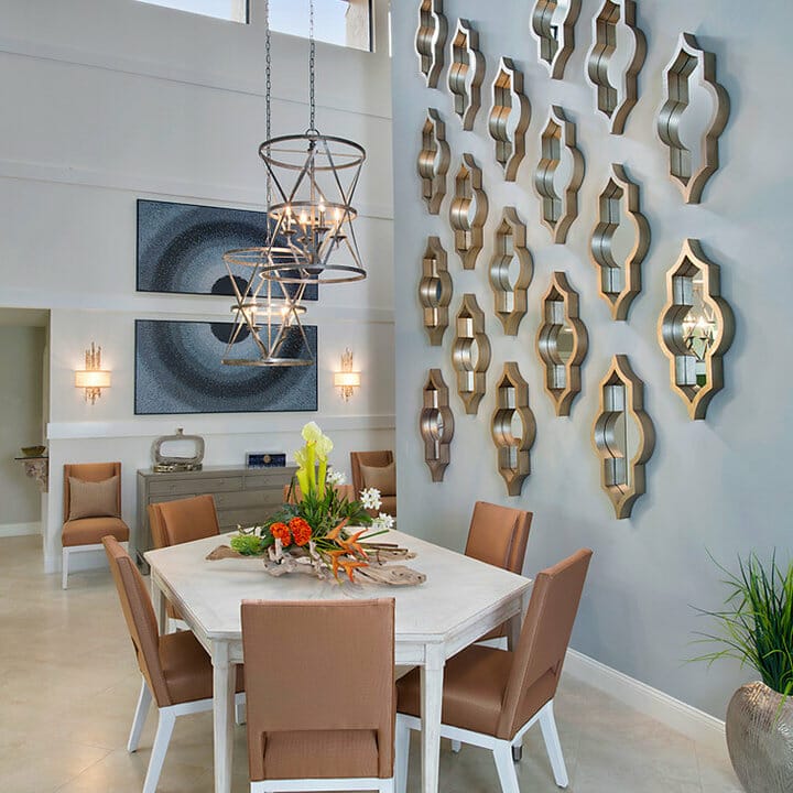 You don’t have to alter your dining room’s style to get some Moroccan vibes. Here, the golden mirror, chandelier, and sconces transport guests to a palatial home in Morocco.