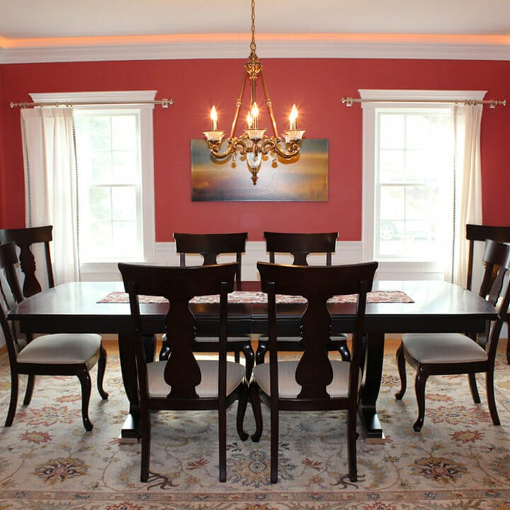 Muted red walls meet the bright white trim and panels in a contrasting manner. Furthermore, they lend the dining area an air of warmth.