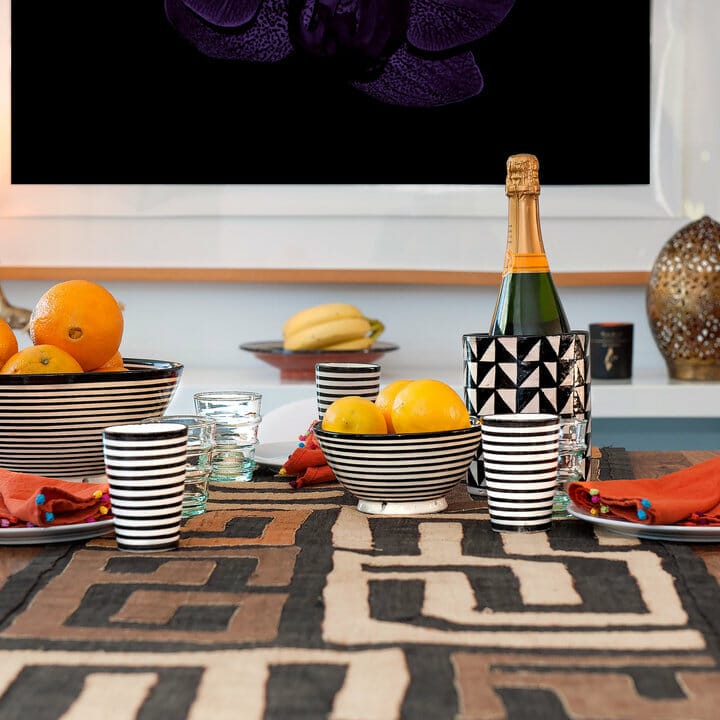 The tableware units display horizontal stripes and geometric patterns. Apart from catching the eye, they inspire stylishness. Lastly, festive table napkins and real fruits enliven the dining area.