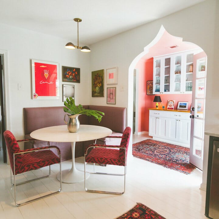 Here, the homeowner unabashedly decorated her dining area. She integrated lots of vivid hues into the interior.