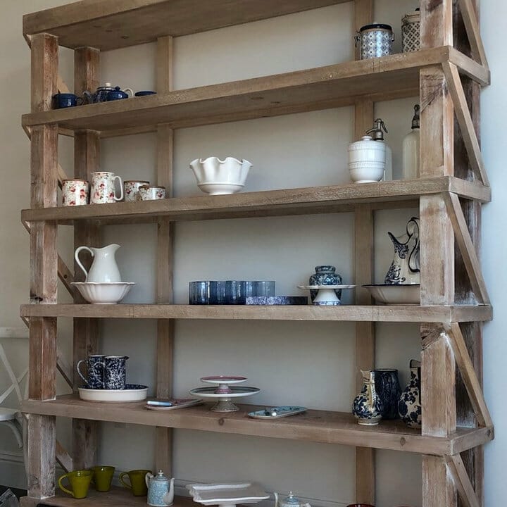 There’s a shabby chic wooden shelving unit in this restoration-style dining room. Furthermore, various tableware pieces nestle on it excellently while emanating Moroccan vibes.
