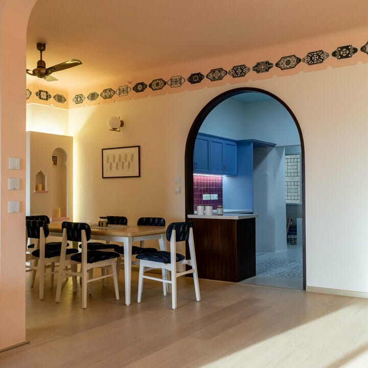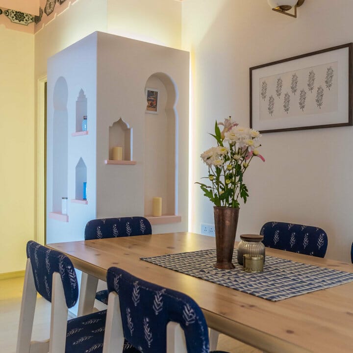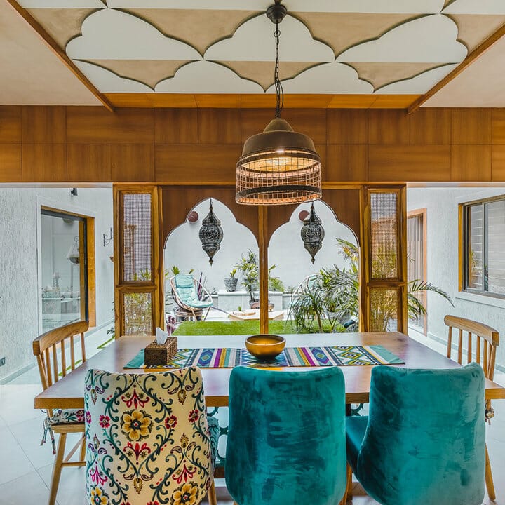The black arch, ornate wall ornaments, and arches infuse Moroccan touches. Due to them, the dining space doesn’t feel basic.