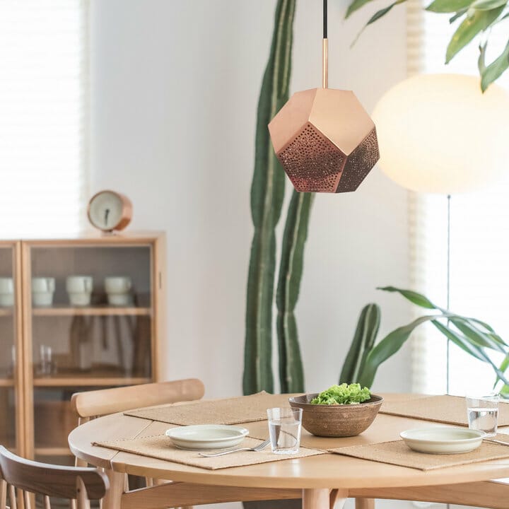 Glass cabinet doors enable the dweller to see her tableware at any time. Moreover, the copper geometric pendant warms the dining space up while injecting a Moroccan zest. In addition, the cactus and leafy houseplant rejuvenate the scene.