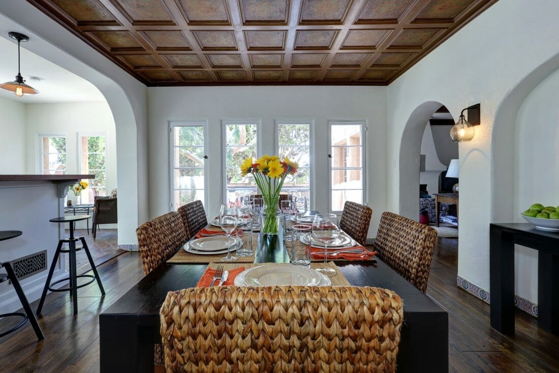 Both arched windows and rustic brick arches generate a fabulous entry to this culinary space. Moreover, the Moroccan dining room table, rug, and chairs prettify the interior.