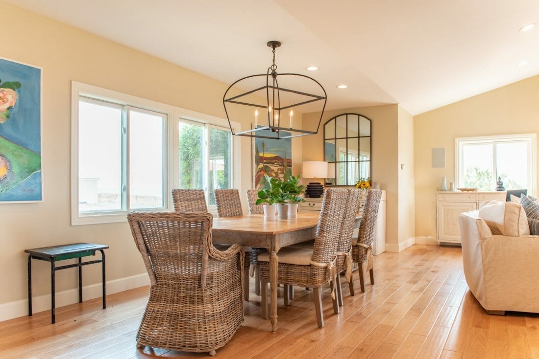 Who says you must splurge on a renovation? This modern farmhouse dining space seems remarkable due to the black metal chandelier and wicker chairs.