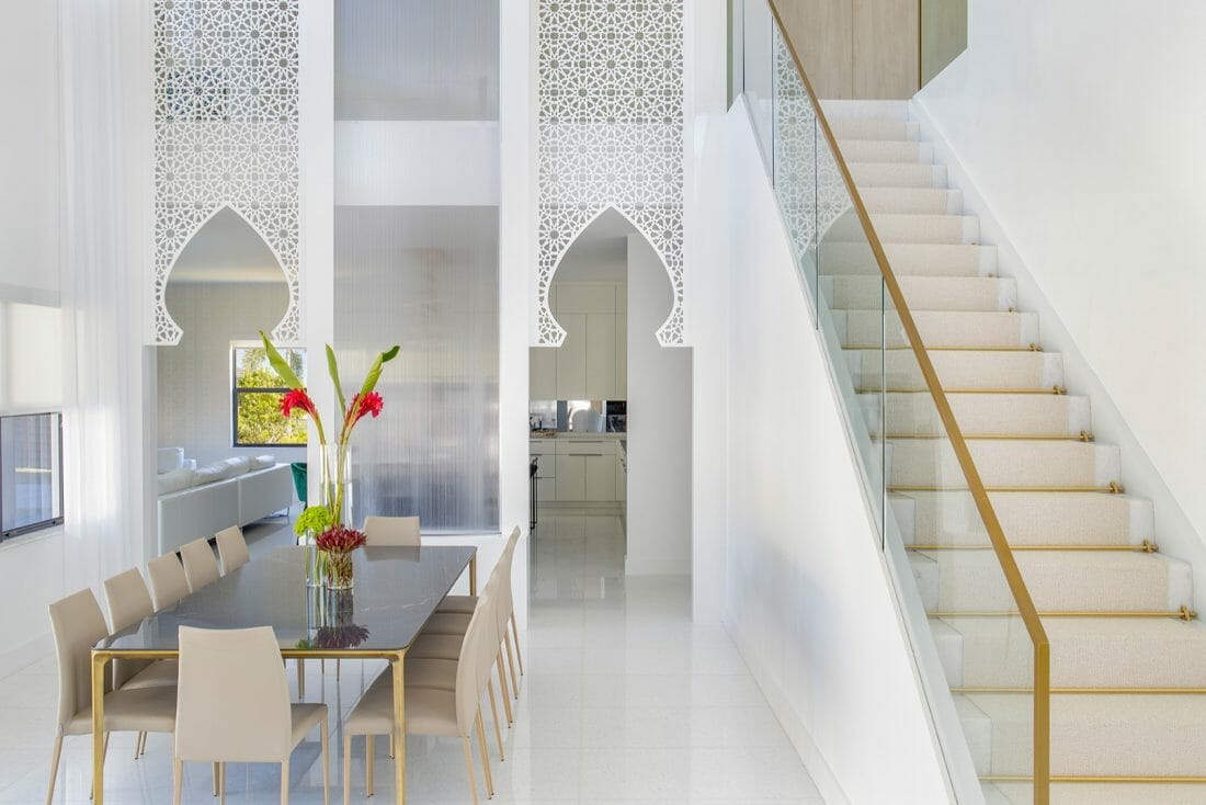 I love this minimalist dining space. Since the area relies on stark white, it appears bright, clean, and open. Moreover, striking Islamic wall panels jazz up the interior.