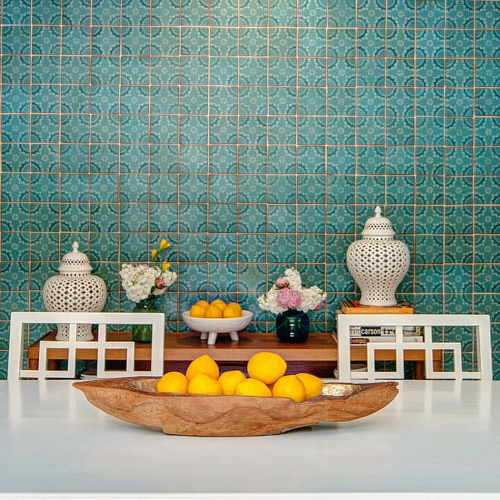 If you’re into an outlandish decorating style, duplicate this look. Here, aqua blue patterned tiles lend the contemporary dining area Moroccan vibes.