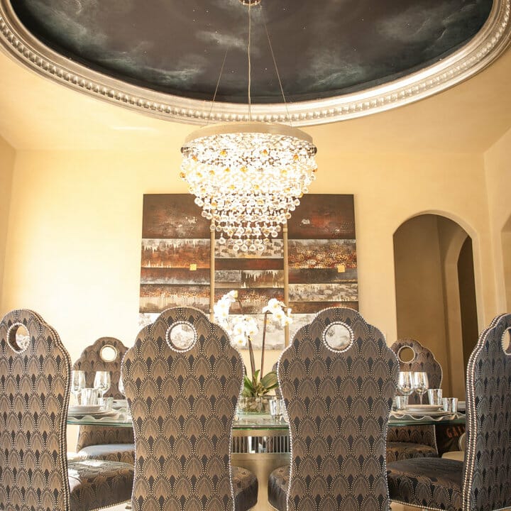 The dramatic ceiling mural draws the eye. Furthermore, the crystal chandelier inspires opulence as well as elegance. Meanwhile, the patterned dining chairs offer Moroccan grandeur.