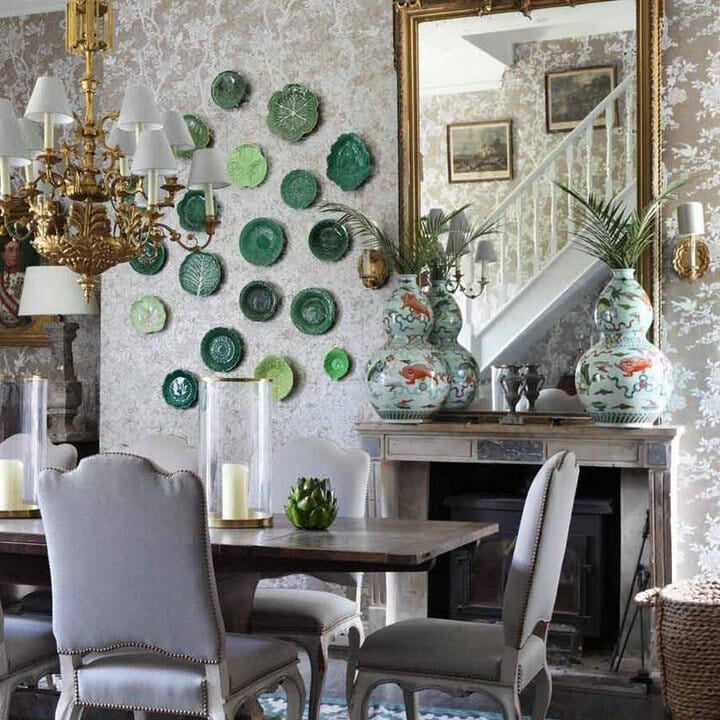 The distressed fireplace lends the area a shabby chic twist. Furthermore, the floral wallpaper and gray dining chairs provide a French country feel. Different green shades bring the interior to life.