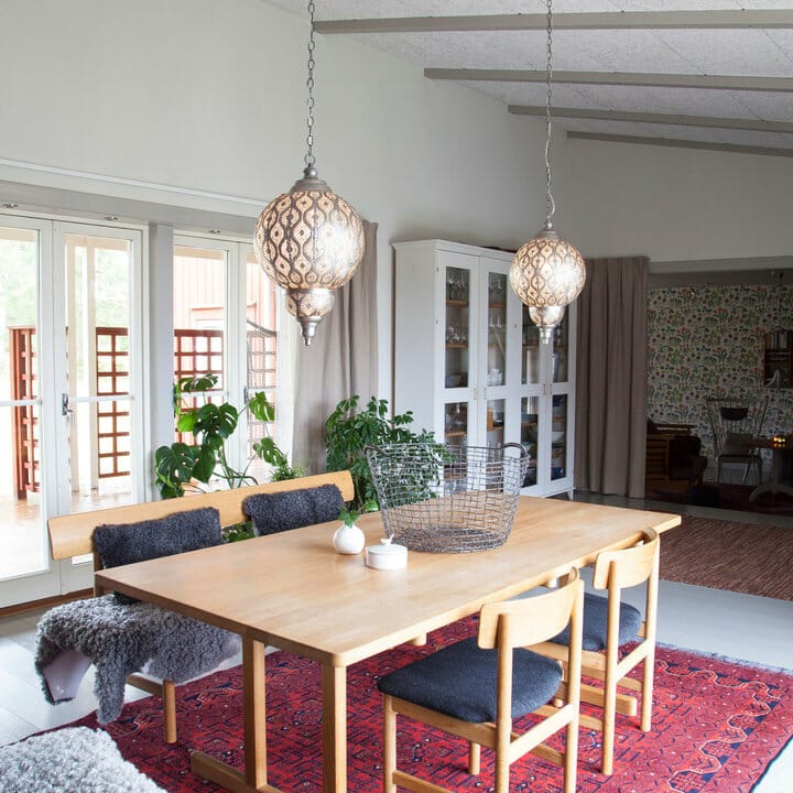 The blonde wooden dining table and chairs give the dining area a light feeling. Cushions and fluffy rugs offer comfort. Lastly, a couple of tropical houseplants introduce a lively look.