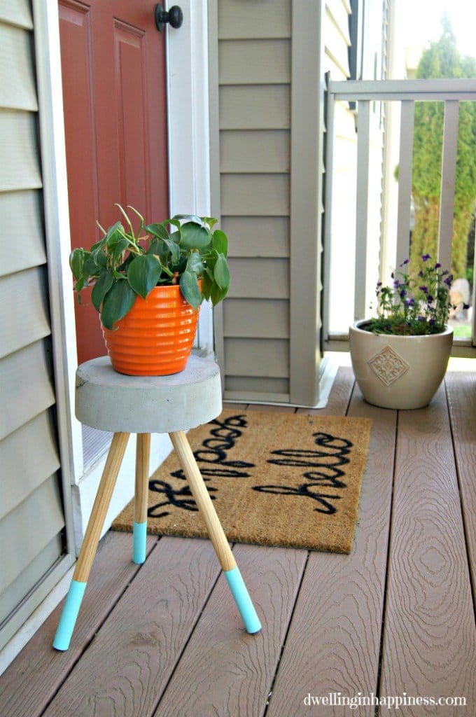 Pictured above is a three-legged plant stand. The hardened concrete tops the wooden base beautifully. Pops of blue and orange make the porch more eye-catching.