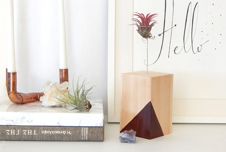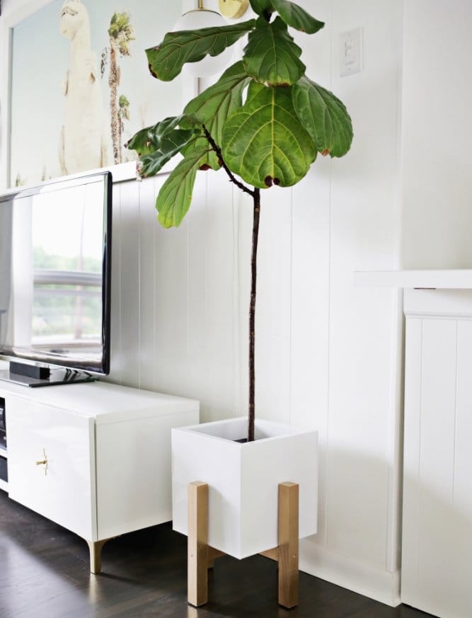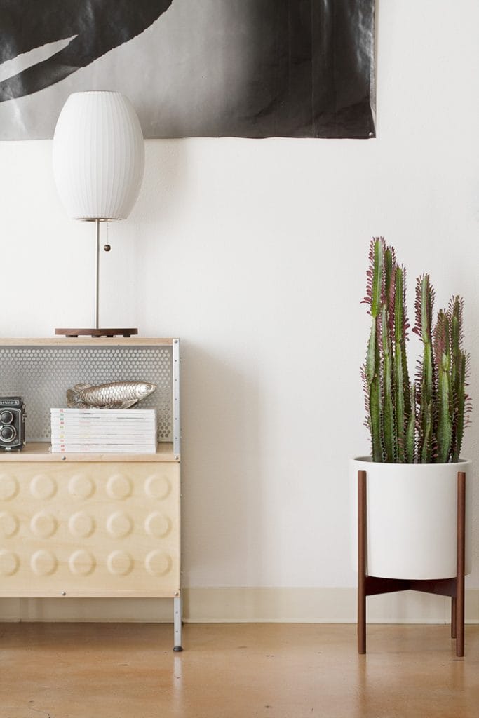 No doubt, this wooden DIY plant stand celebrates mid-century modern design. It calls attention to the white cylinder planter.