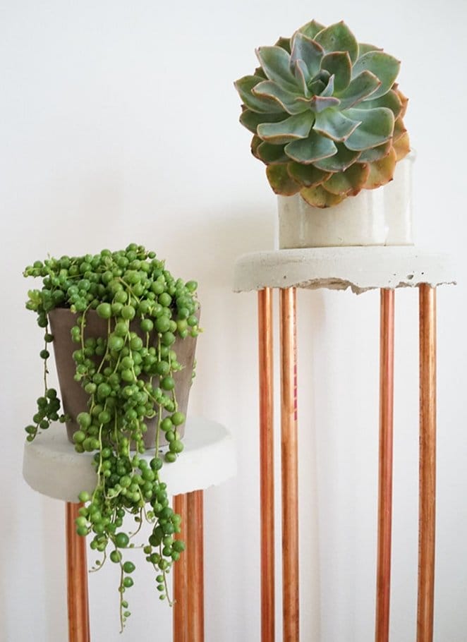 As you can see, the plant stands feature concrete tops and copper legs. They deliver industrial charm to the room.