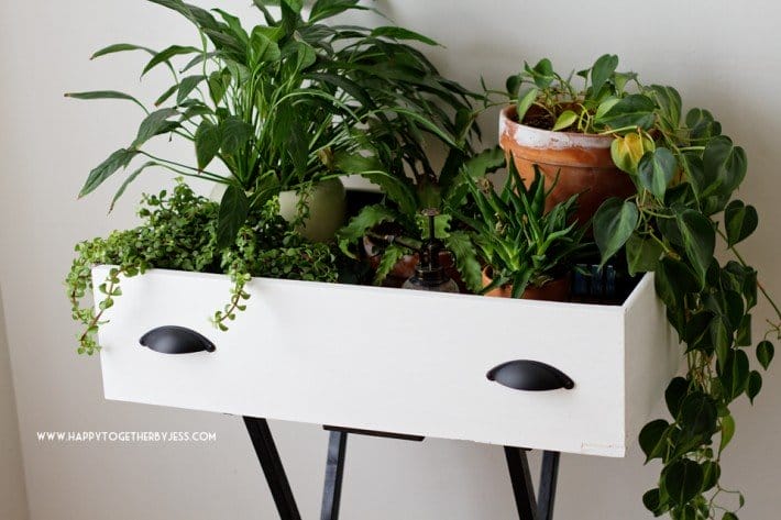 I bet none of your neighbors has this plant stand, because the old drawer is what constructs it. The black and white contrast is truly appealing.