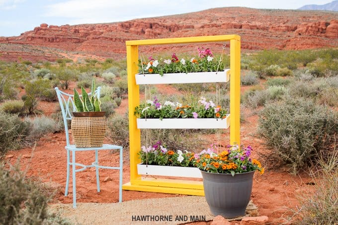 You fall in love with this outdoor plant stand. It employs a yellow frame and white gutters. To hang the plants, you can use either some rope or clear wire.