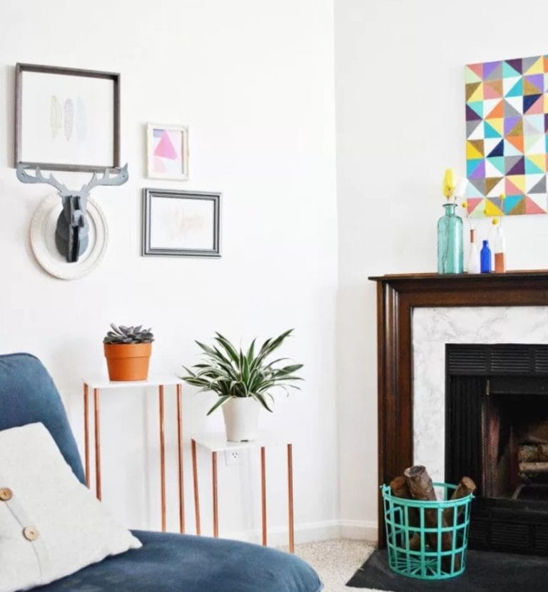 Those DIY plant stands boast marble tops and copper legs. They glamorize the living room in a split second, while the fireplace elicits a sense of intimacy.