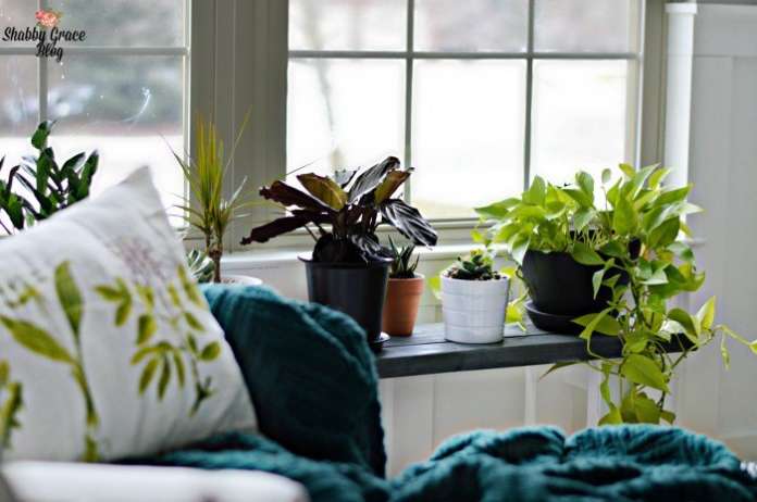 Some potted greenery sits on a black-painted wood bench plant stand. They fill the space and make the room smell fresh.