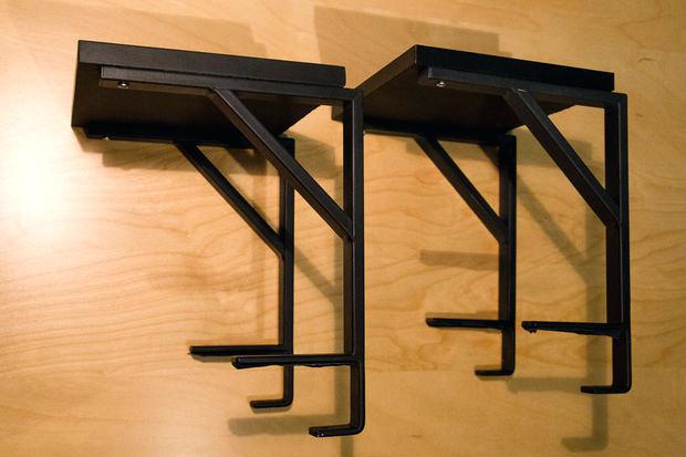 Do you have limited space? It is no problem. These black wall-mounted speaker stands make a big statement without taking up floor space. They are such a hot contrast to the wooden backdrop.