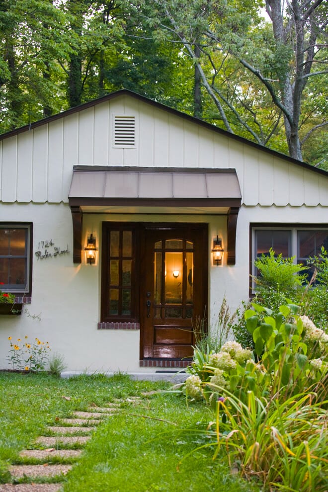 Timber awning is still a choice for a simple and classic house. To make it look wider, you can make your awning wider than your front door frame. For an additional touch, you can also build pillars for each side.