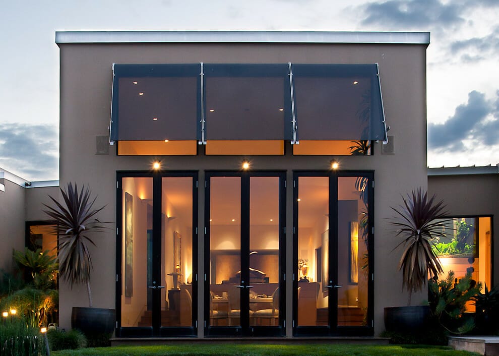 Then, the best door awning for this concept is the tilted fiberglass awning. The shape will not cover your beautiful doors but seems outstanding. Moreover, you can choose the black or brown fiberglass so it will not be that clear and has a see-through effect.