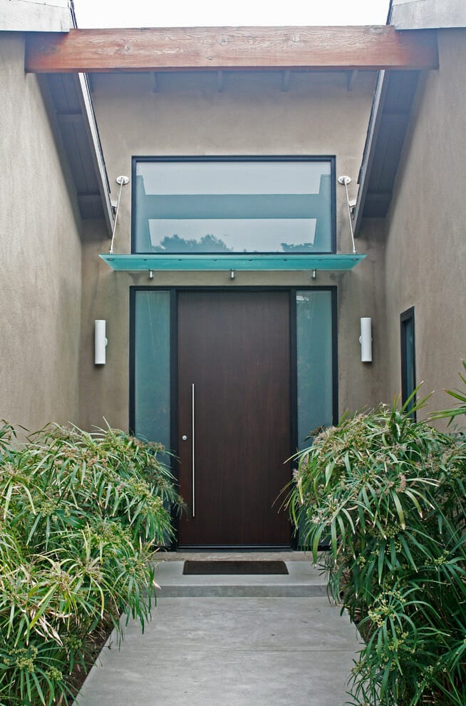 There are so many front door awning ideas for a minimalist house. One of the best recommendations is the glass awning. It will not attract too much but is still eye-catching for your house.