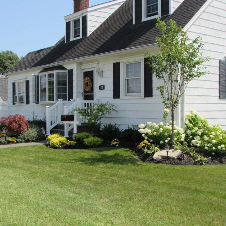 It is common landscaping with many flower beds that will match your coastal-style home.