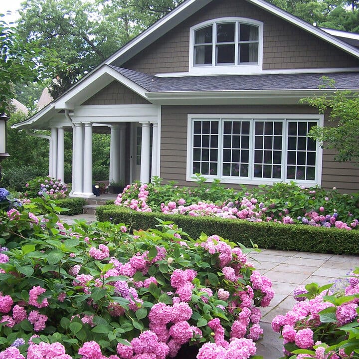 8. Pink Hydrangea Beds with Boxwood Hedge