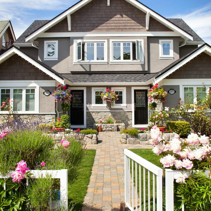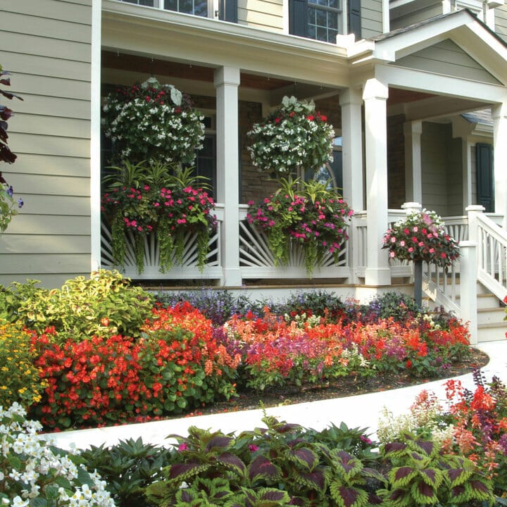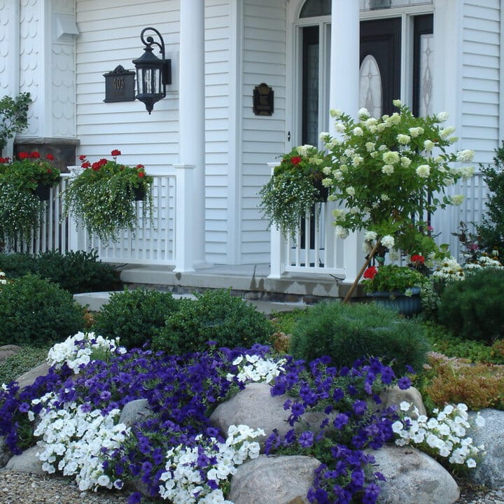 If you have a small front yard, you can go with a hanging flower bed and a mini semi-circle bed in front of your porch.