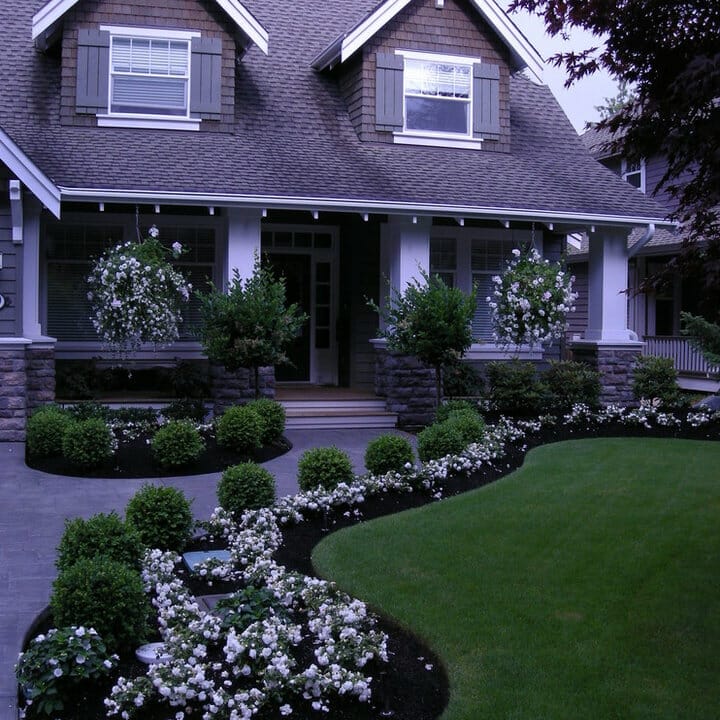 Front yard landscaping ideas that are simpler to adopt but have the same aesthetic value and freshness are to plant a white flower bed with greenery around it.