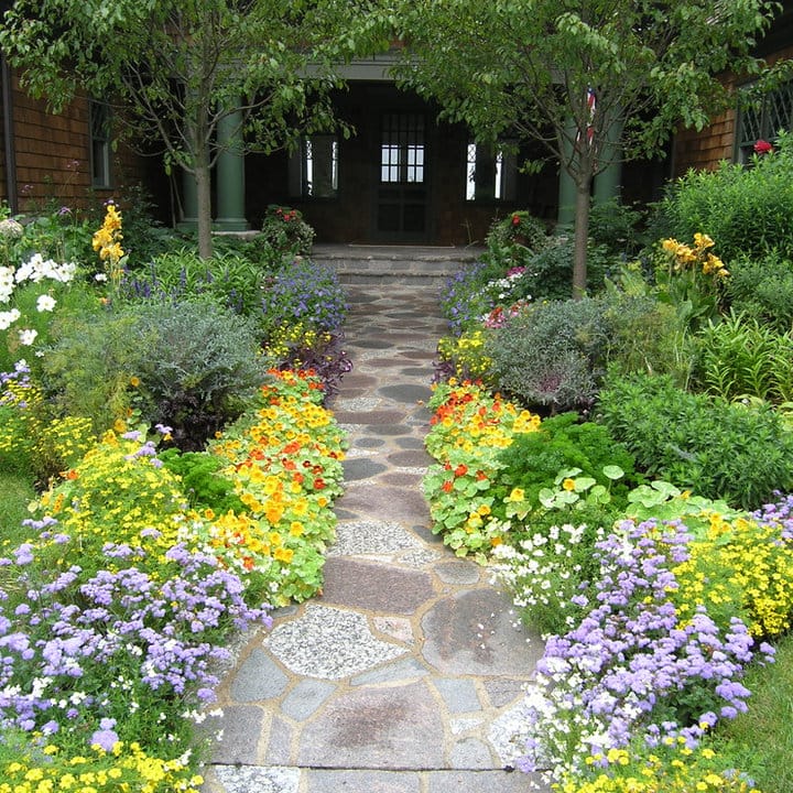 There are many perennial plants that you can choose to beautify your front yard, two of which are Snapdragon and Phlox. You can freely select colors and combine the two to plant around your flagstone walkway.