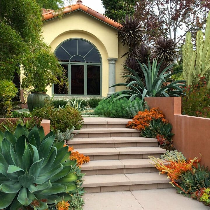 Instead, you can still go with various front yard flower bed ideas with succulents inside the planter boxes and pots along your entrance stairs.