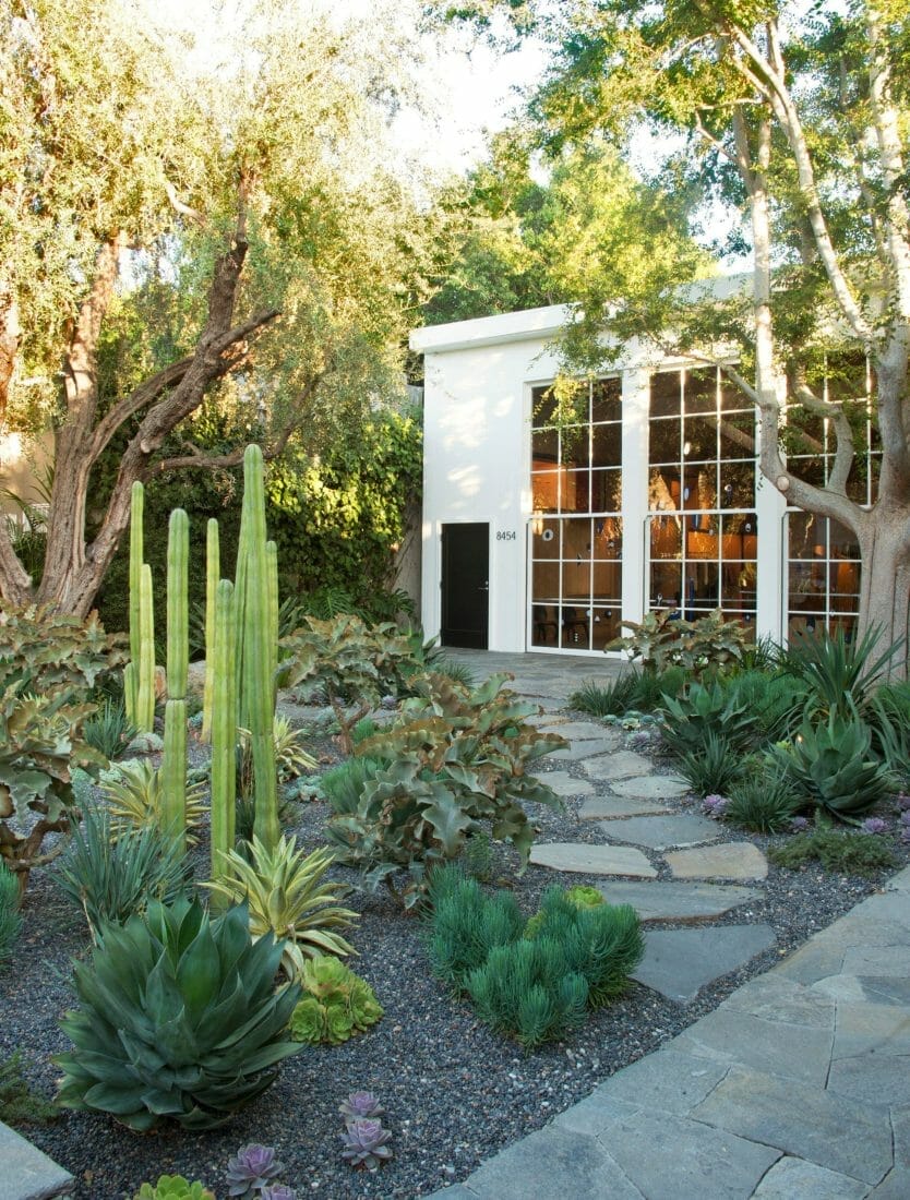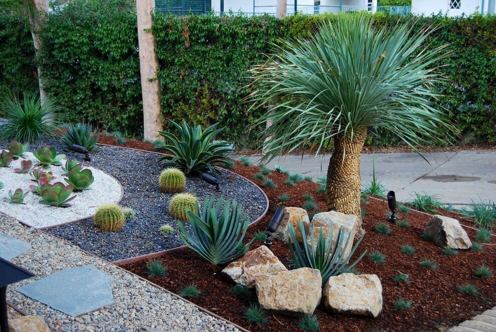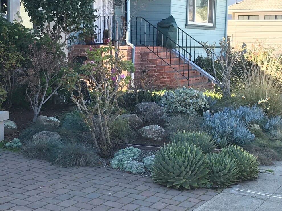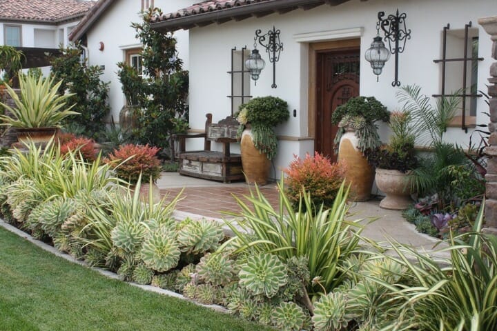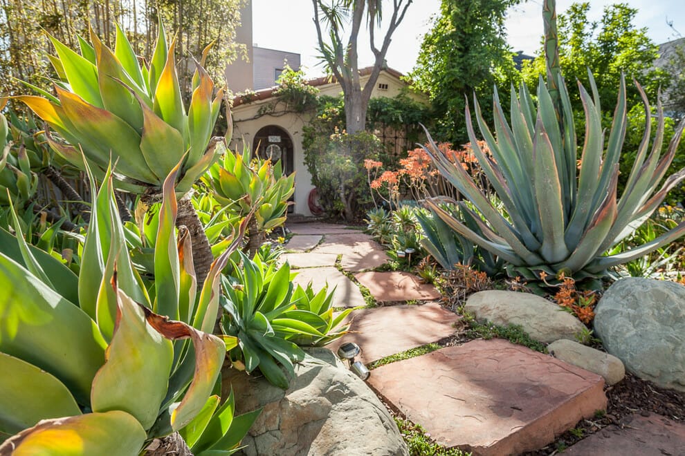 One of the front yard succulent garden ideas is planting the succulents on the side of the entrance path. You can combine cactus, aloe, echeveria, euphorbia, and agave.