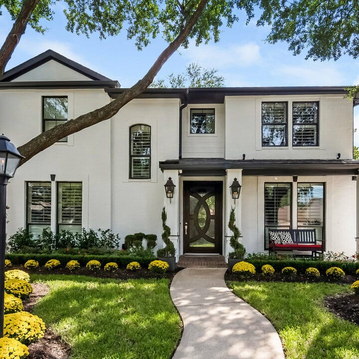 Yellow blooms and hedges brighten up the front garden. Moreover, the bench, red seat cushion, and monochromatic printed throw pillows lend the porch a focal point.
